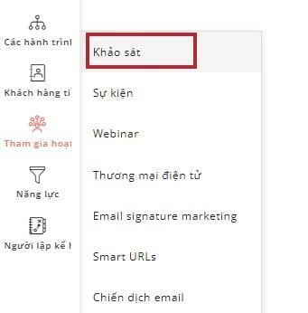 Bước 1. Tại trang chủ của Zoho Marketing Hub chọn Tham gia hoạt động, tìm đến Khảo sát