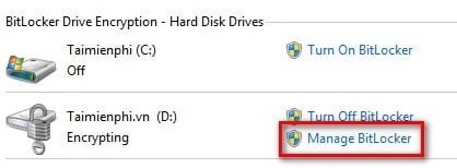 Để thay đổi mật khẩu click chọn Manage BitLocker của ổ đã khóa bằng mật khẩu: