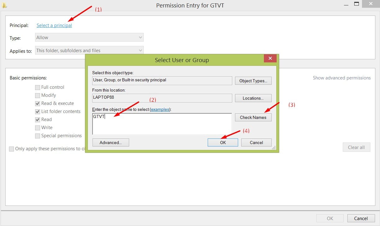 Bước 5: Chọn Select apricipal → Rồi nhập User quản lý thư mục đó → Chọn Check Names → OK