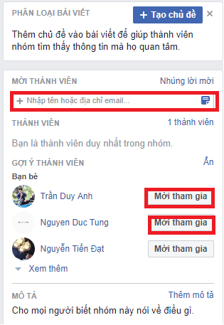 Ở trong trang của nhóm, bạn và thành viên nhóm có quyền mời bạn bè của mình tham gia, bằng các gõ địa chỉ Email, Số điện thoại hoặc tên tài khoản Facebook của người đó => sau đó nhấn Enter để thêm vào.