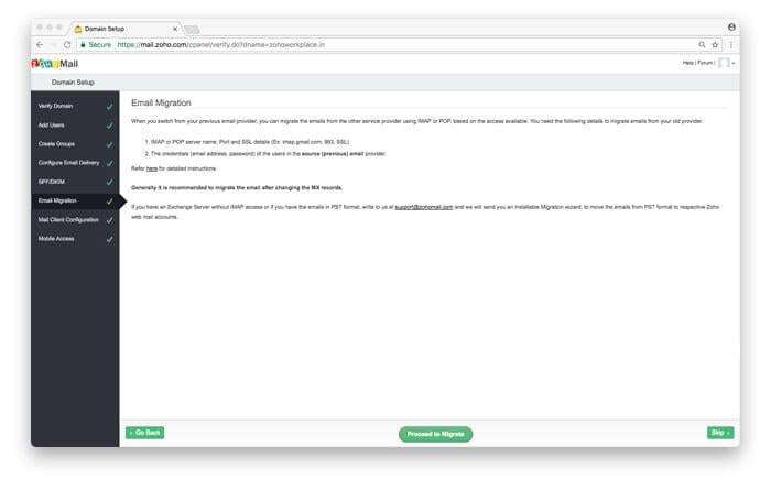 - Trong Di chuyển email, bạn có thể di chuyển email từ các nhà cung cấp dịch vụ khác (sử dụng IMAP hoặc POP). Bạn có thể nhấp vào " Proceed to Migrate " và để xem hướng dẫn di chuyển được tuân theo. Để biết thêm thông tin, hãy tham khảo trang trợ giúp này về di chuyển POP / IMAP