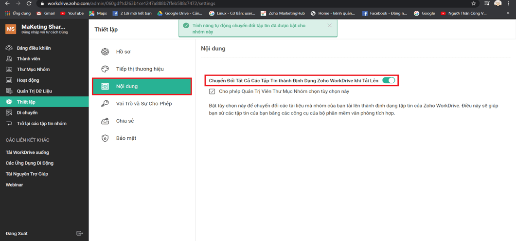 - Ở Nội dung bạn có thể chuyển đổi các tập tin thành định dạng zoho Workdirve khi tải lên bằng cách bật chức năng này